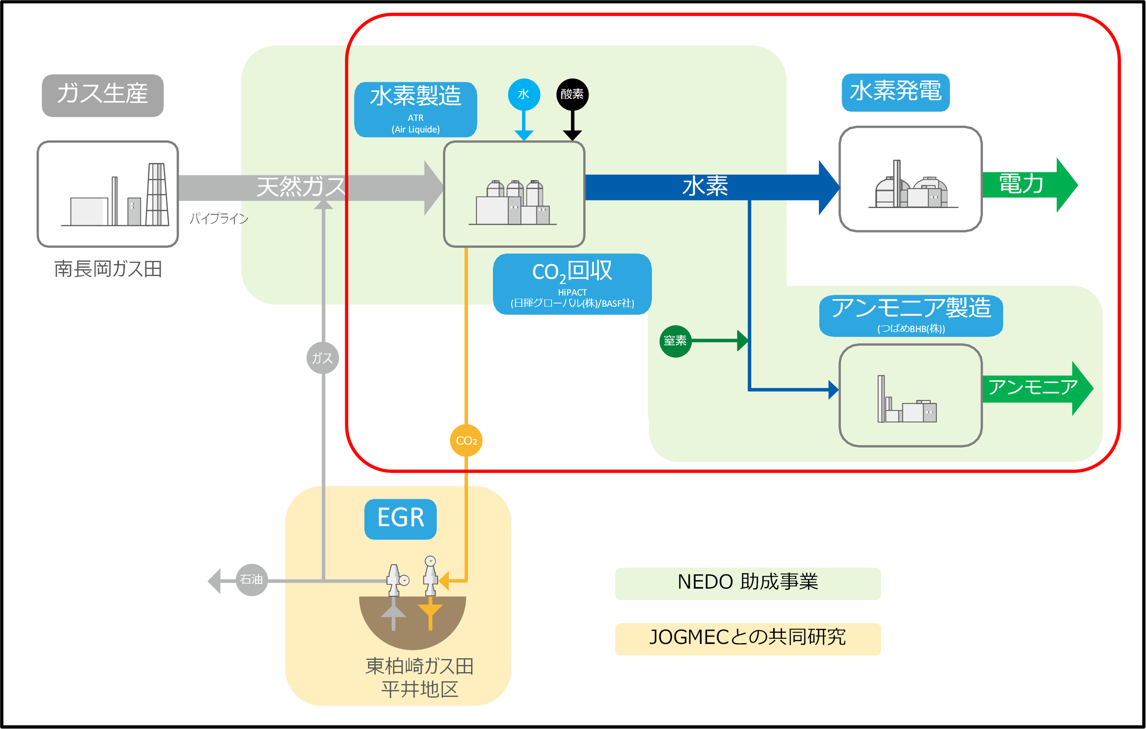 | 体制 | ・水素・アンモニアの製造およびCO₂回収について:NEDO の助成事業として採択 ・国内枯渇油ガス田を活用したCO₂貯留可能量把握を含むCCUSについて:JOGMECとの共同研究として実施 |